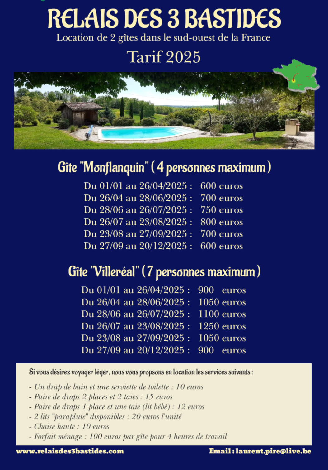 TarifsNous vous proposons en location une maison avec sa piscine privée. Celle-ci comporte 2 gîtes, avec une capacité maximale de 11 adultes.
